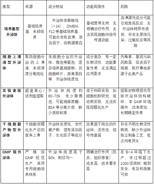干细胞外泌体的制备工艺决定其“身份属性”,市场上流通的产品可分为以下五大类,其价值与风险呈显著梯度差异: