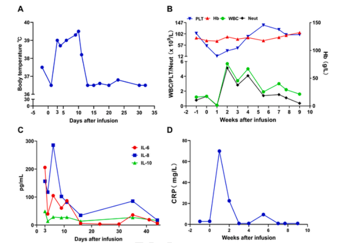 图4 输注Anti-BCMA CAR-T细胞的临床反应。(A)输注CAR-T后患者体温的变化。(B)输注CAR-T后患者PLT、Hb、白细胞、中性粒细胞水平的变化。(C)输注CAR-T后IL-6、IL-8和IL-10的水平。(D)输注CAR-T后患者CRP的变化。
