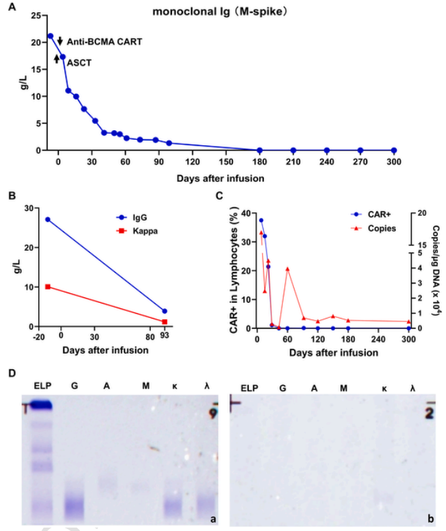 图5 输注CAR-T后的关键指标水平。(A)输注后检测M蛋白的水平。(B)输注后IgG和Kappa的变化。(C)输注CAR-TCAR-T细胞扩增水平与CAR-DNA拷贝水平。(D)血清和尿液中 IgG和Kappa均为阴性。
