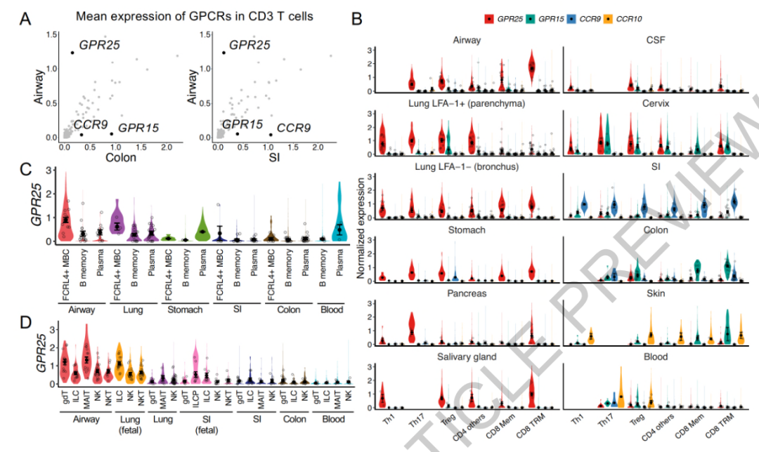 单细胞转录组数据分析结果表明,GPR25在呼吸道(包括鼻腔、气管和支气管)中的淋巴细胞表达水平显著高于肠道淋巴细胞。这一发现表明GPR25可能在呼吸道和非肠道粘膜的免疫监视中发挥重要作用。其中,GPR25在CD8 T细胞中的表达较为突出,这可能与这些细胞在粘膜免疫中的功能有关。值得关注的是,人类脑脊液(CSF)中的T细胞也存在GPR25的表达,这暗示GPR25可能在CNS的免疫调节中也具有重要意义。