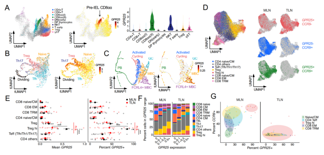 针对胸腺淋巴细胞的单细胞转录组分析结果表明,GPR25的表达水平在特定天然T细胞亚群的成熟过程中存在上调,这表明GPR25可能有助于先天T细胞迁移到目标组织。而在扁桃体中,GPR25的表达水平在激活的B细胞和T细胞中出现了上调,这同样表明其可能与淋巴细胞的迁移作用相关。值得关注的是,在胸腺和外周淋巴组织中,GPR25的表达水平均在调节性T细胞(Tregs)的发育过程中出现上调,这表明其可能在维持免疫耐受和预防自身免疫反应中发挥作用。